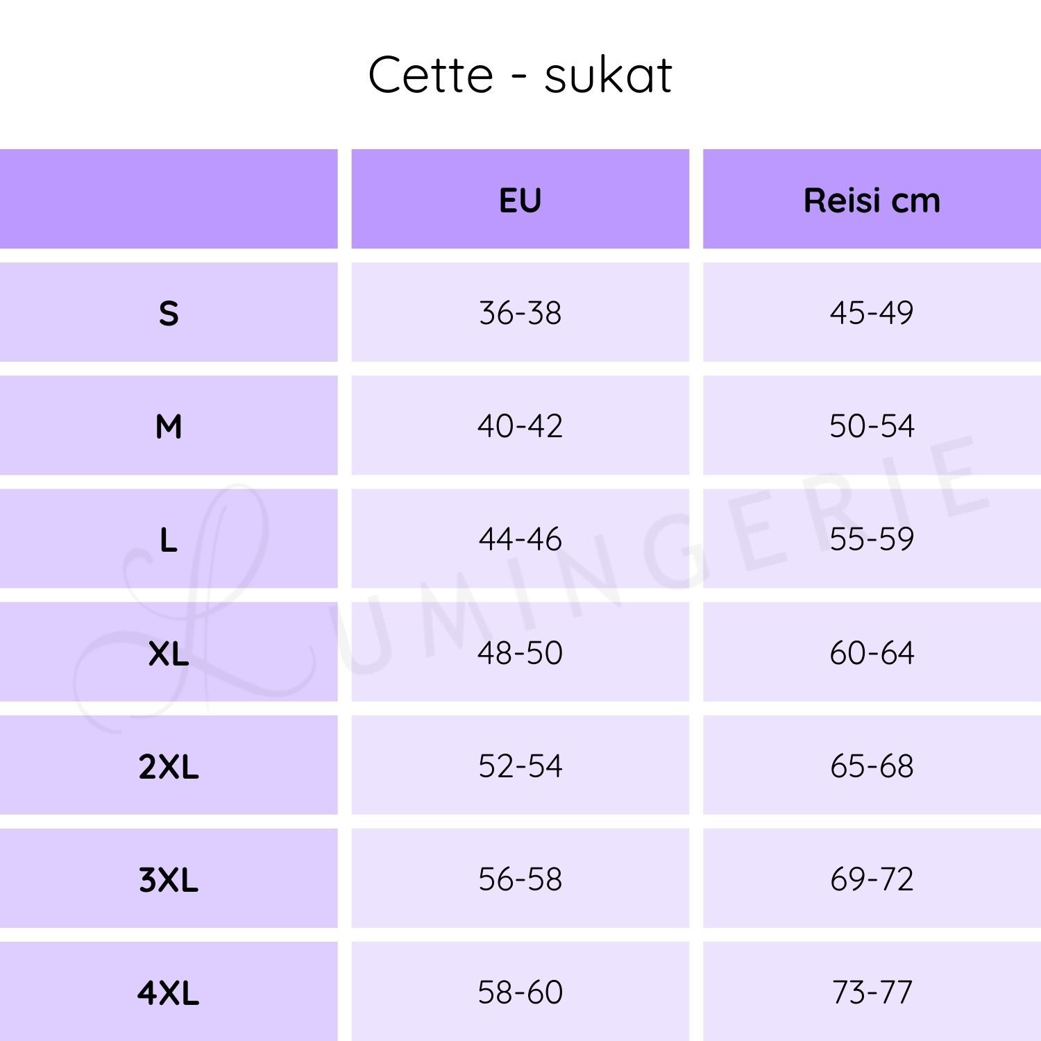 Valitse koko alla olevasta taulukosta tai valikosta.